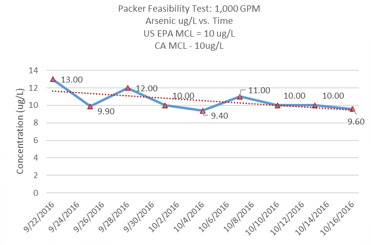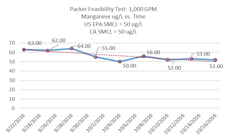 Successful applications of the packer feasibility test have provided numerous clients with confidence in well modifications. PFT modifications have saved millions of dollars for water purveyors through improvement of well water quality without the necessitation of installation and upkeep of water treatment systems. The following figures display a dual packer system installation diagram, as well as graphs displaying wellhead concentrations of contaminants after a packer installation.
